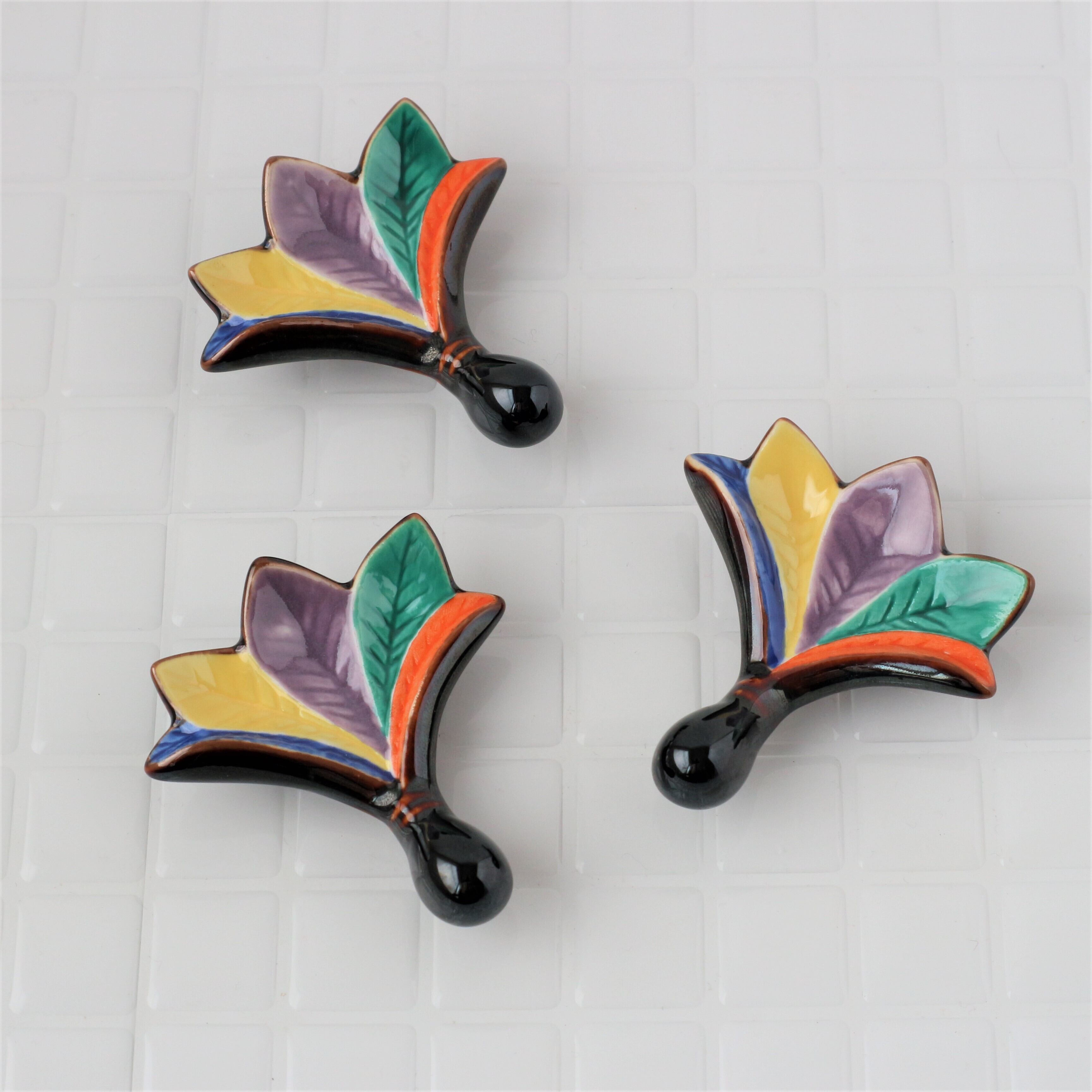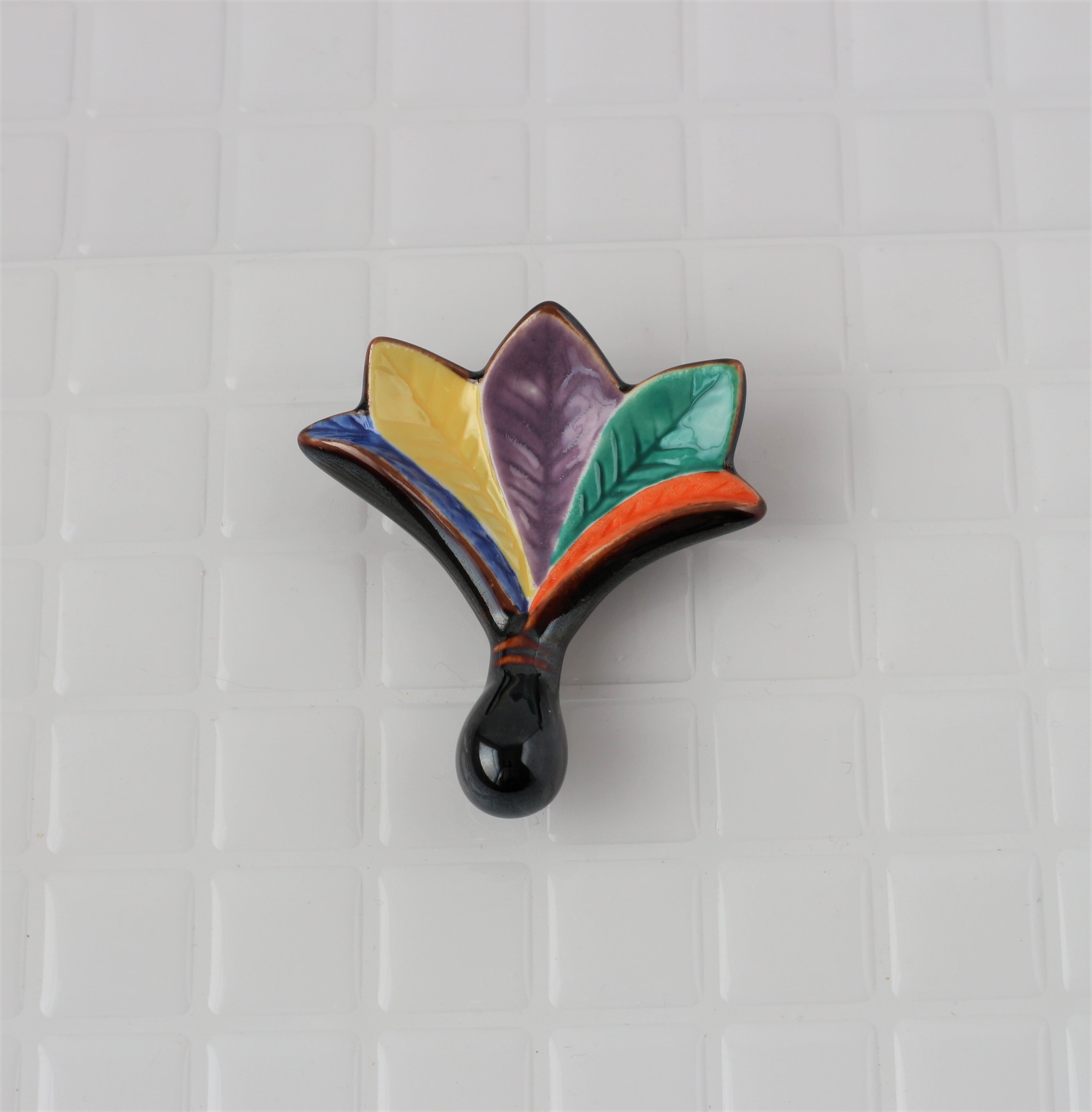 蒼・黄・薄紫・緑・橙の5色で羽根を染め分け、ツヤツヤとした黒いムクロジの実で品良く締めて完成させています。